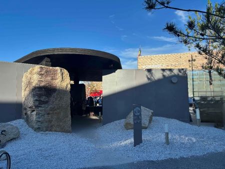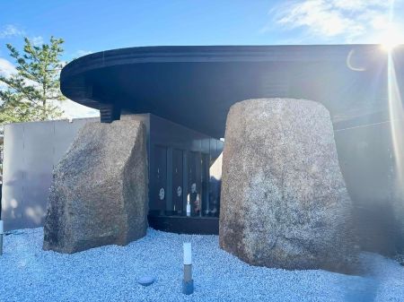 「残念石」と言われる、大阪城の石垣を再建する際に切り出されたものの実際には使われず、そのまま放置されていた石を再活用しようというアイデアからトイレの柱として取り入れられる事になったそうです。